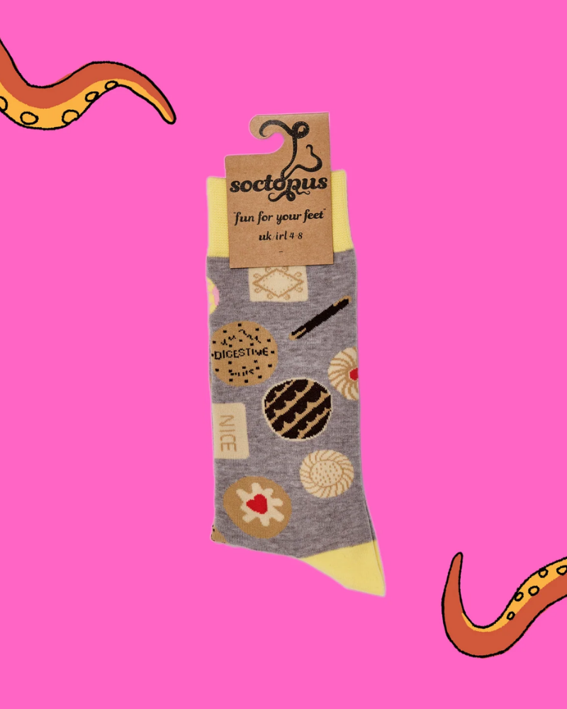 Step into cosy charm with these British Biscuits Crew Socks. Featuring a fun, quirky pattern inspired by classic British biscuits, they bring a cheeky twist to your everyday style. Made for comfort and a snug fit, these socks keep your feet warm while adding a playful pop to your outfit. Perfect for biscuit lovers and sock enthusiasts alike!