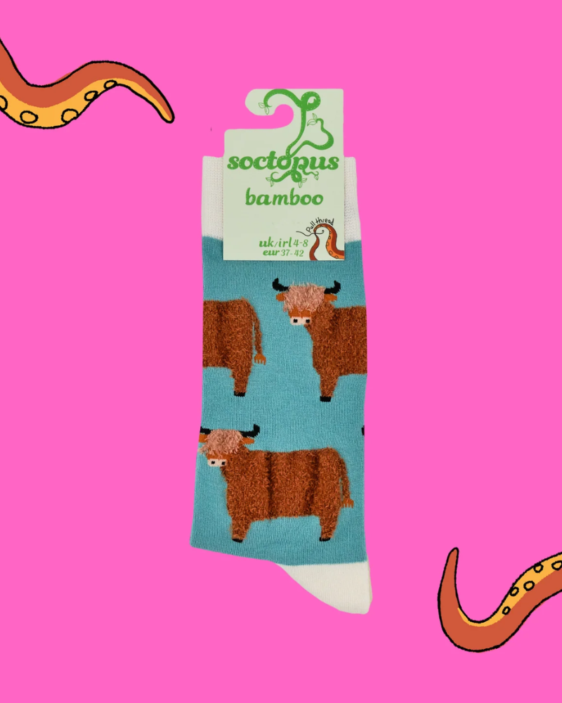 Introducing the Wee Hairy Coo Bamboo Socks! Experience comfort like never before with the softest, cutest socks around. Keep your feet cool and dry all day long with the natural moisture-wicking properties of bamboo. Say goodbye to boring socks and hello to funky, sustainable style.