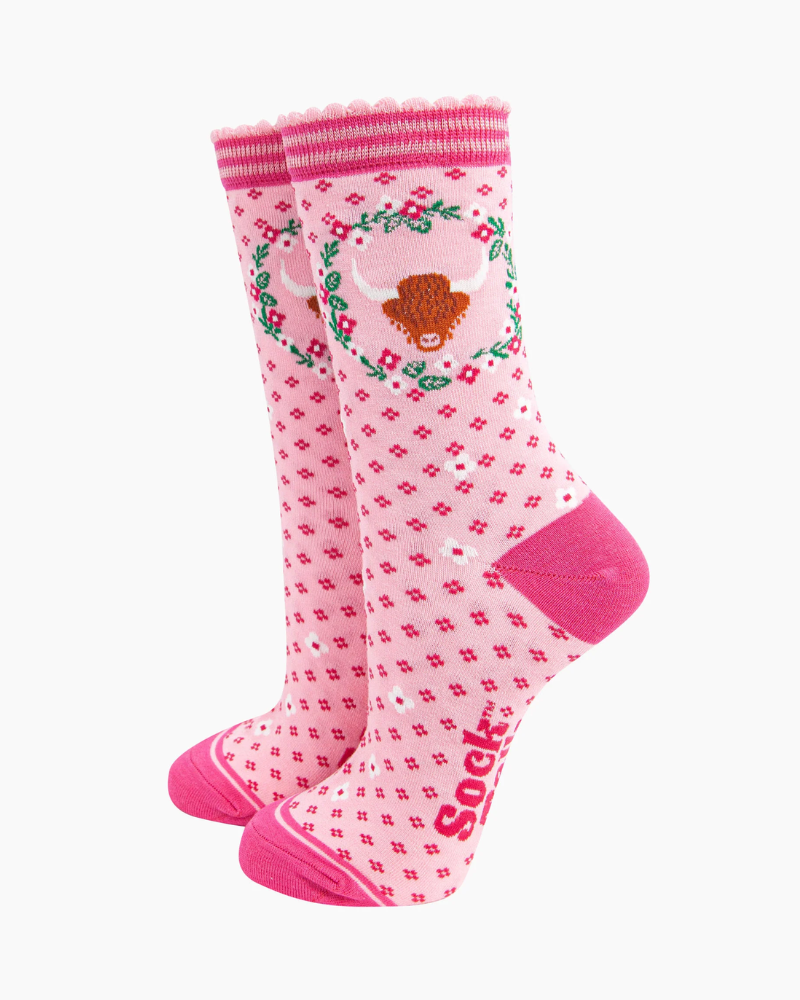 Pink Floral Highland Cow Wreath Bamboo Socks