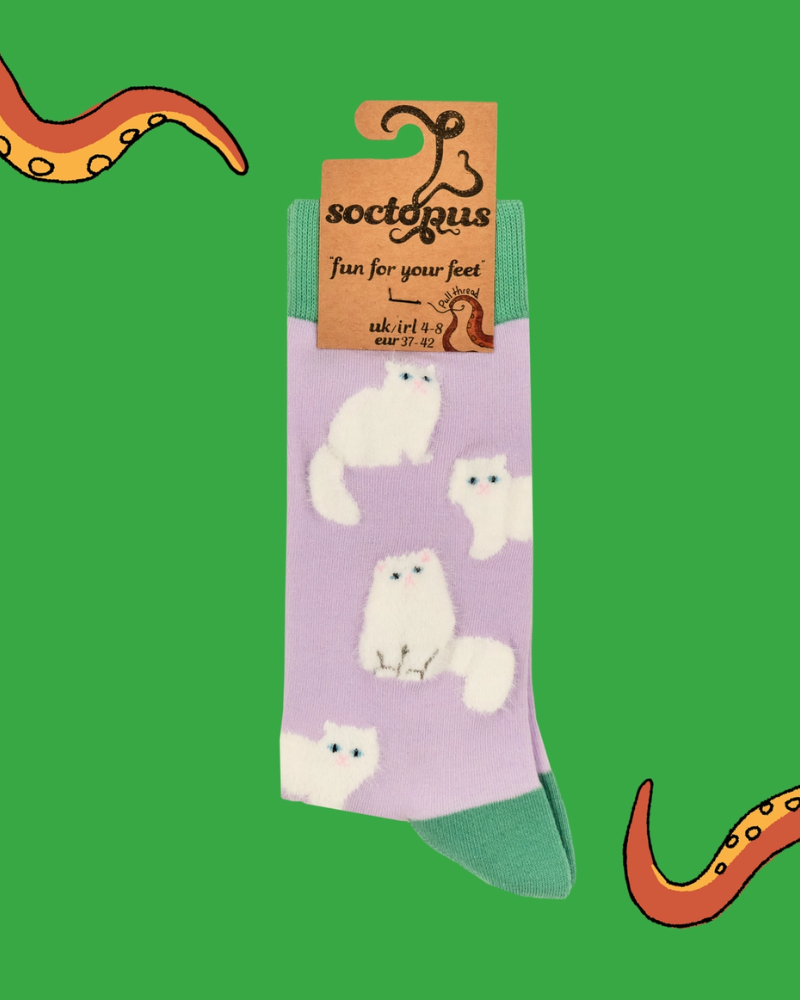 Fluffy White Cat Ladies Crew Socks by Soctopus