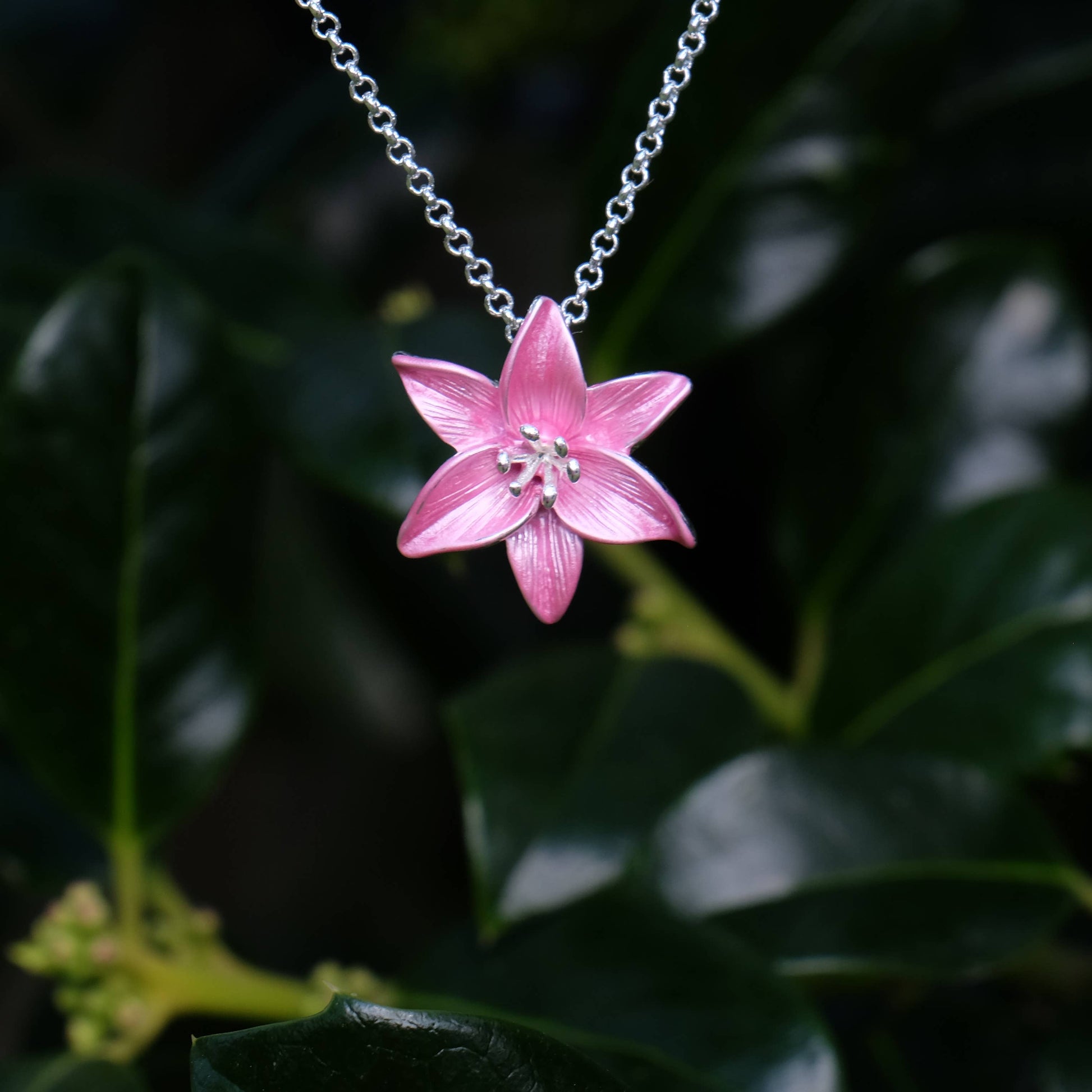 Lily silver plated flower pendant necklace, with hand finished pink enamel petals. This beautiful necklace embodies nature with its intricate realistic design and attention to detail. The Lily is a symbol of purity, fertility, and 100 years of love, with Pink Star Gazer Lilies in particular symbolising femininity and admiration. Lilies make fabulous gifts for nature lovers, perfect for any occasion and are the gift to give for a 30th wedding anniversary.