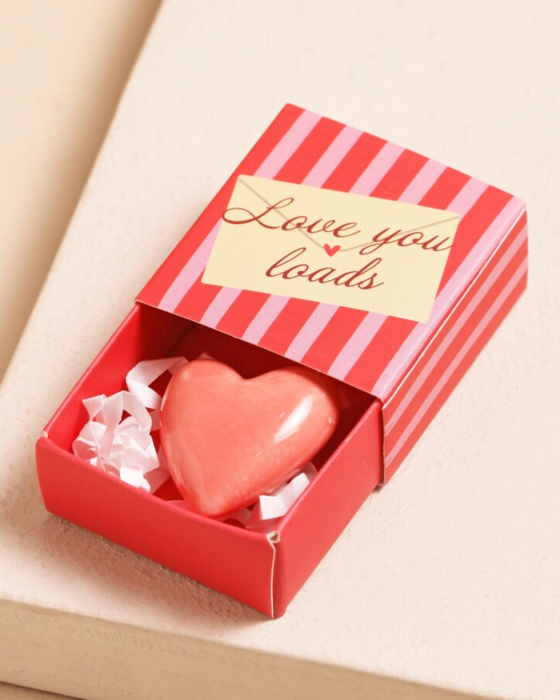 A sentiment gift for a loved one, featuring a sweet red heart charm gift boxed with the message "Love you loads".