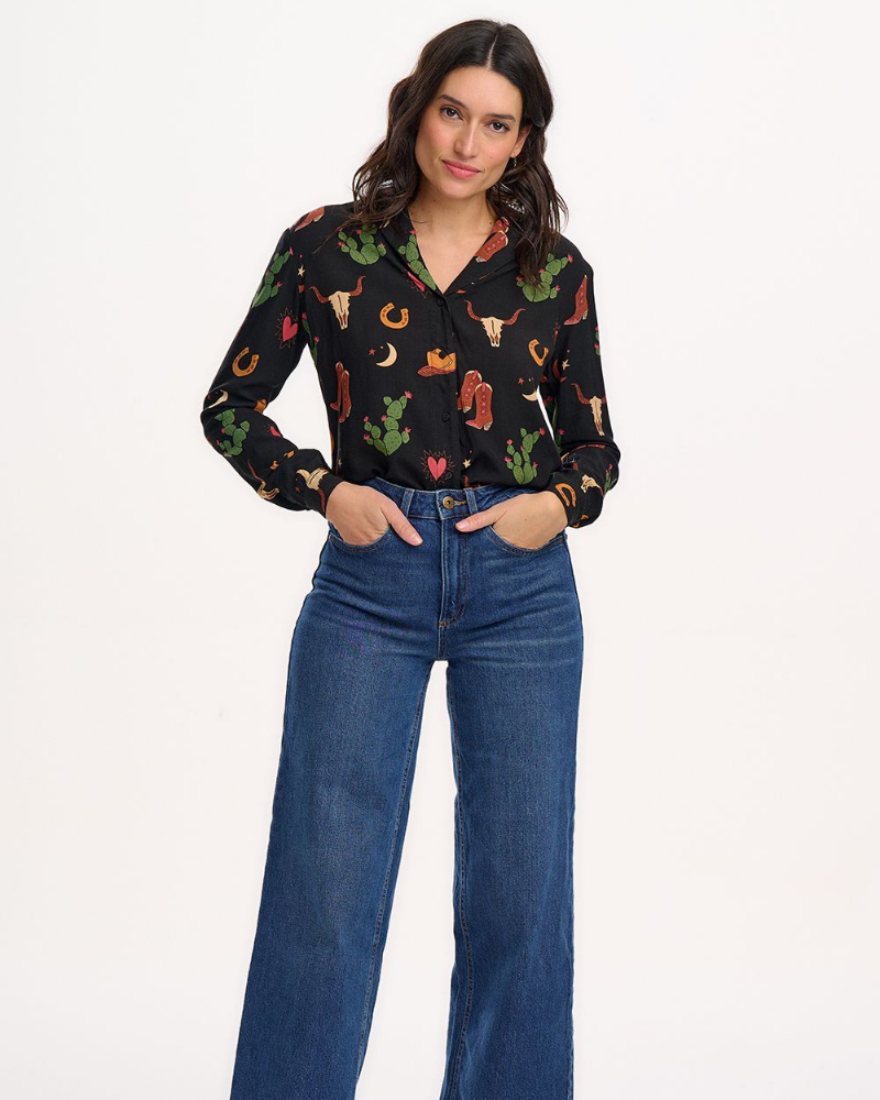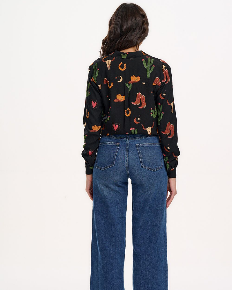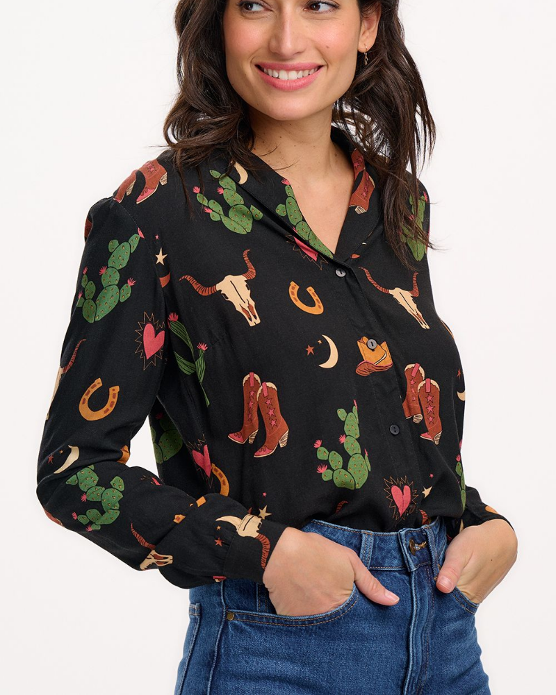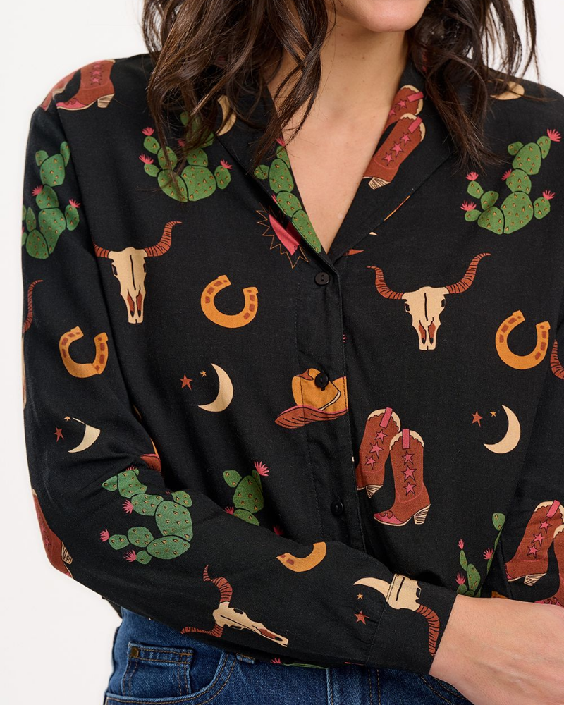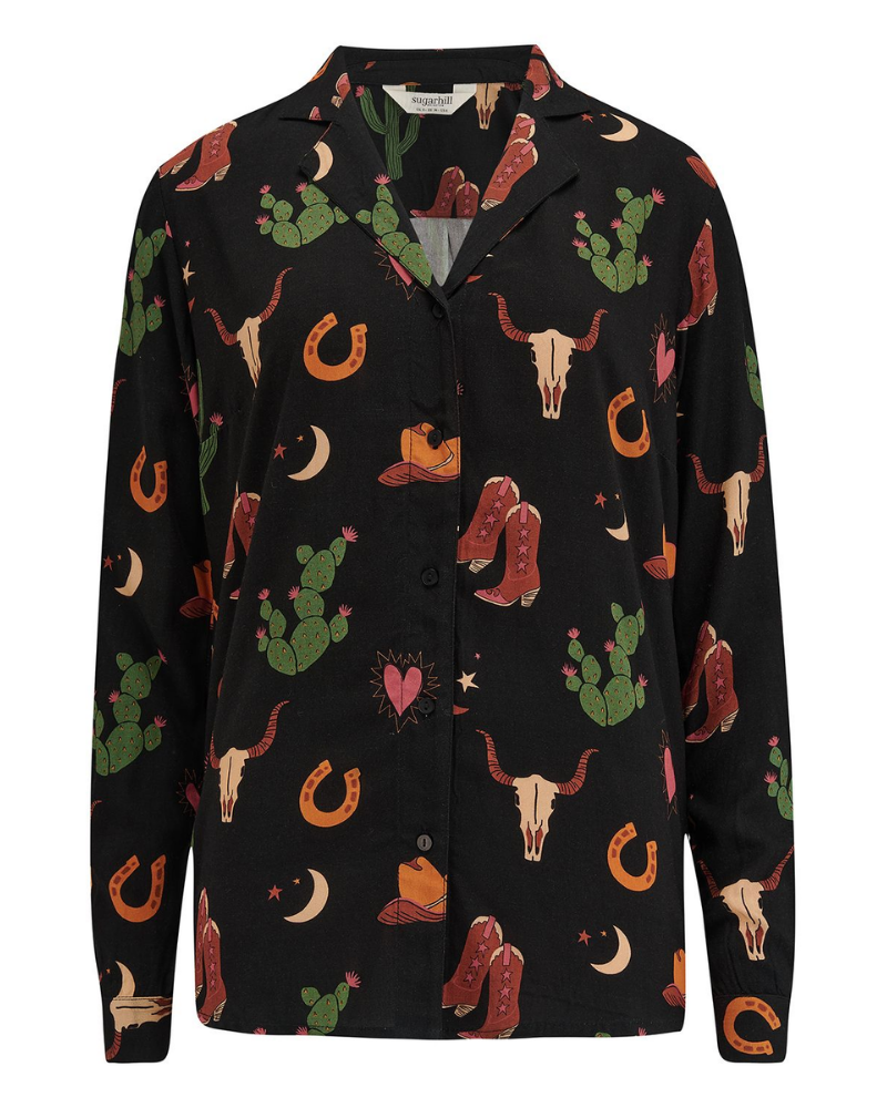 Add some flare to your wardrobe without the flares with the Micah Revere Cowgirl Shirt. Ride into Spring/ Summer 25 with a gorgeous new Western Wardrobe. Featuring cow skulls, horseshoes and cowboy hats, this sizzlin' shirt will let you stirrup your style in the office or at home. Giddee Up and get to the store while stocks last!