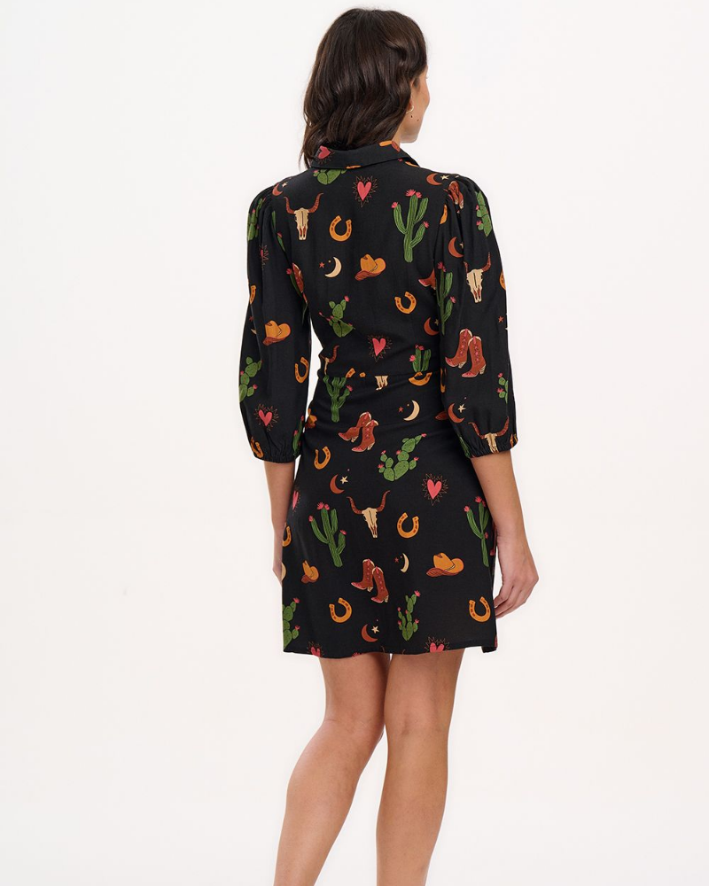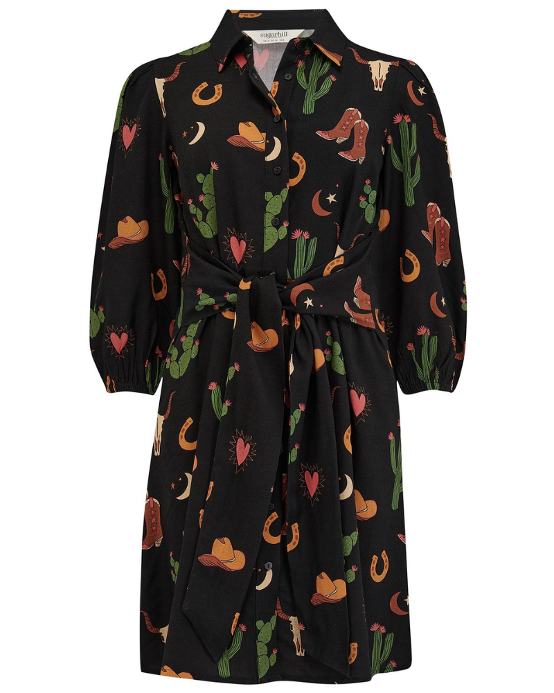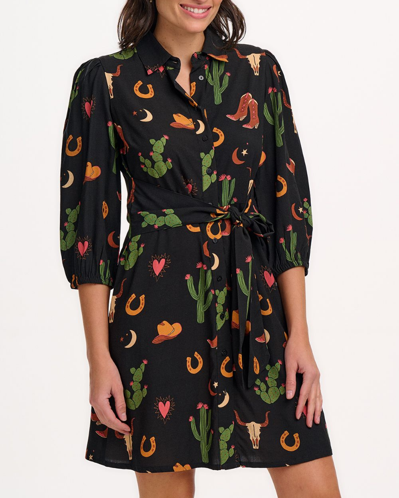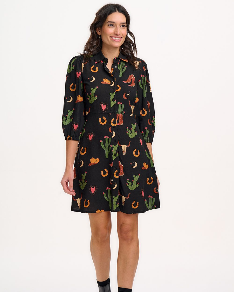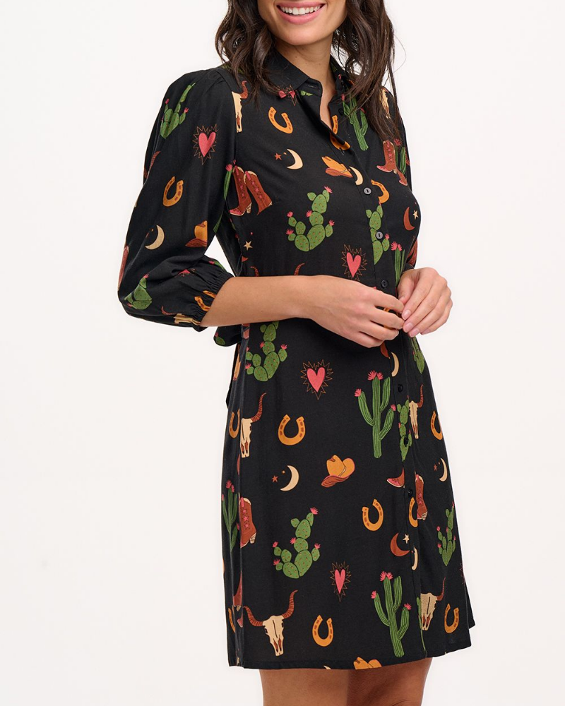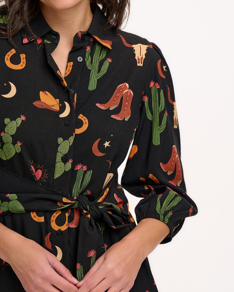 Buckle up, and button up the Mildred Cowgirl Shirt Dress this Spring/ Summer. Throw on your best knock-off Stetson and boots to ride into some rodeo realness. This signature piece will elevate any Western Wardrobe with its perky print featuring cacti, horseshoes and cowboy boots.