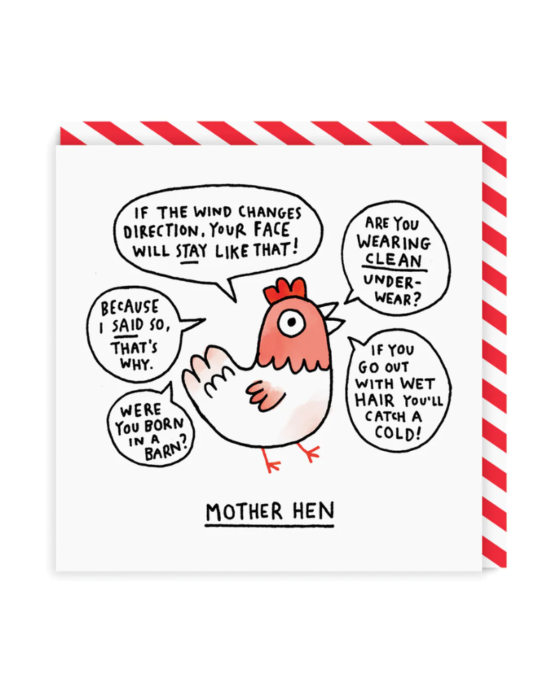 Looking for the clucking perfect card for your mum? The Mother Hen greeting card features hilarious quotes from mum that we've heard countless times. Perfect for Mother's Day, birthdays and special occasions.