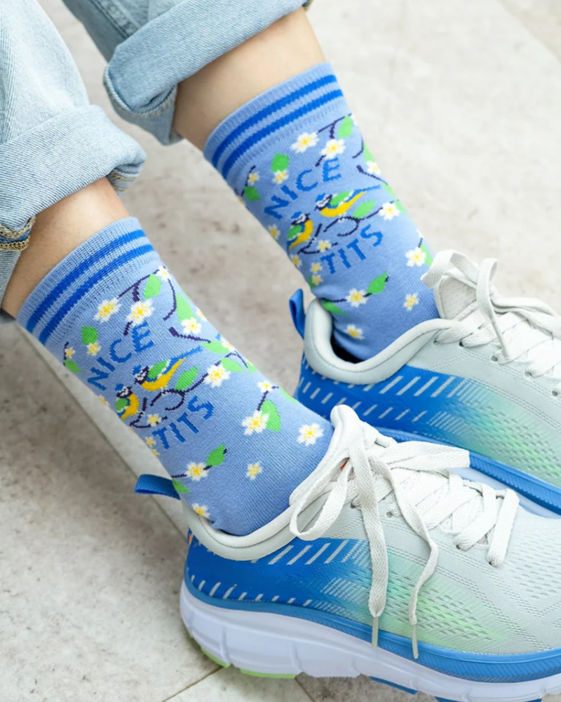 Add a playful touch to your outfit with our Nice Tits Combed Cotton Socks. Crafted from soft combed cotton, these socks keep your feet comfy all day while showing off a cheeky blue tit design that’s sure to make you smile. Perfect for adding a dash of fun to your everyday essentials.