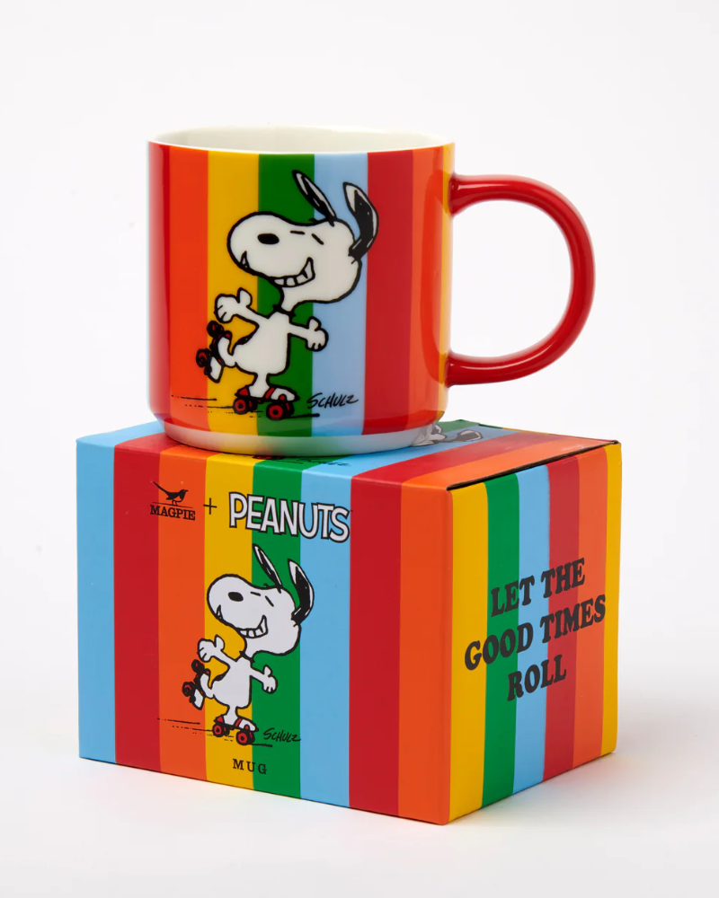 Bring a splash of colour and fun to your day with the Peanuts Snoopy Let The Good Times Roll Mug. Featuring Snoopy on roller skates with a vibrant rainbow backdrop, this playful mug is perfect for enjoying your favorite drink while embracing good vibes and joyful moments.