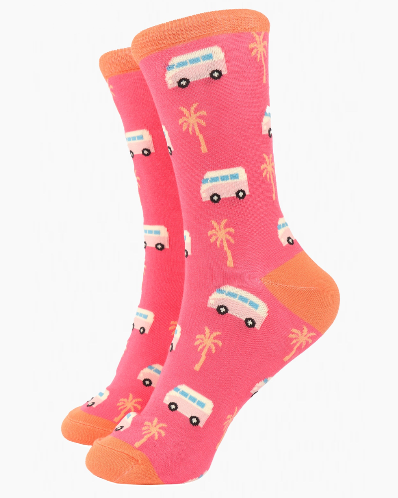 Step into the fabulous world of glamping with these Pink Campervan Holiday Ladies Socks! Featuring a vintage campervan design and playful palm trees, these socks are the perfect accessory for your next outdoor adventure.