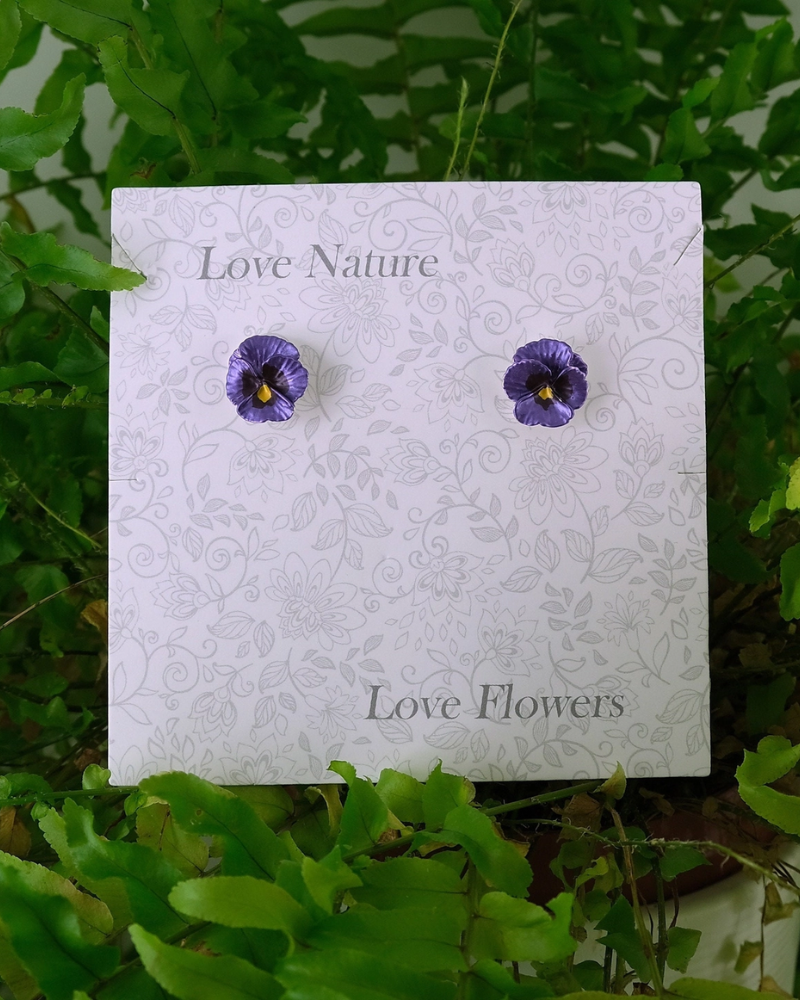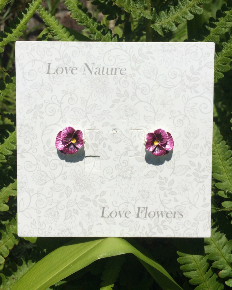 Pansy silver tone flower stud earrings, with hand finished pink and deep purple enamel petals. These beautiful earrings embody nature with their intricate realistic design and attention to detail. The Pansy is a symbol of love, compassion, remembrance and nostalgia. Pansies are the birth flower for the month of February. Pansies make fabulous gifts for nature lovers and are perfect for any occasion.