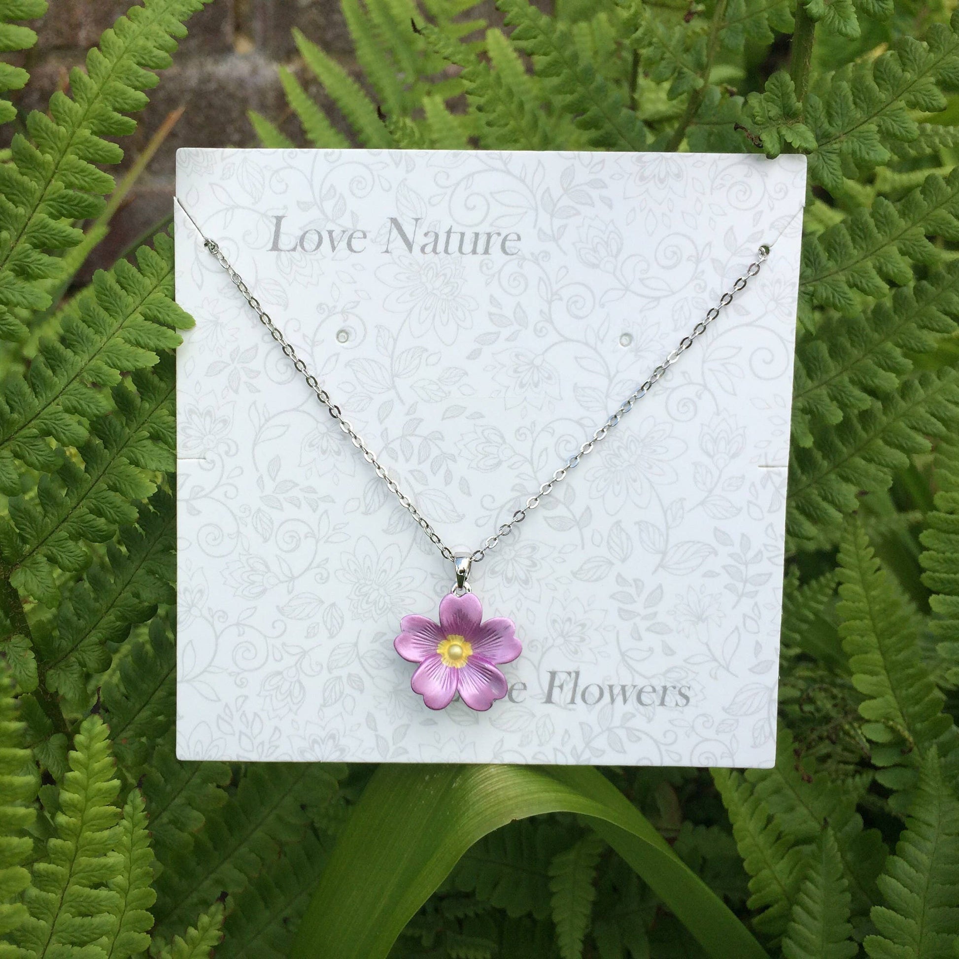 Primrose pink hand enamelled rhodium finished pendant. Our beautiful pendant embodies nature with its intricate design and attention to detail. The primrose flower represents young love and makes a special gift.
