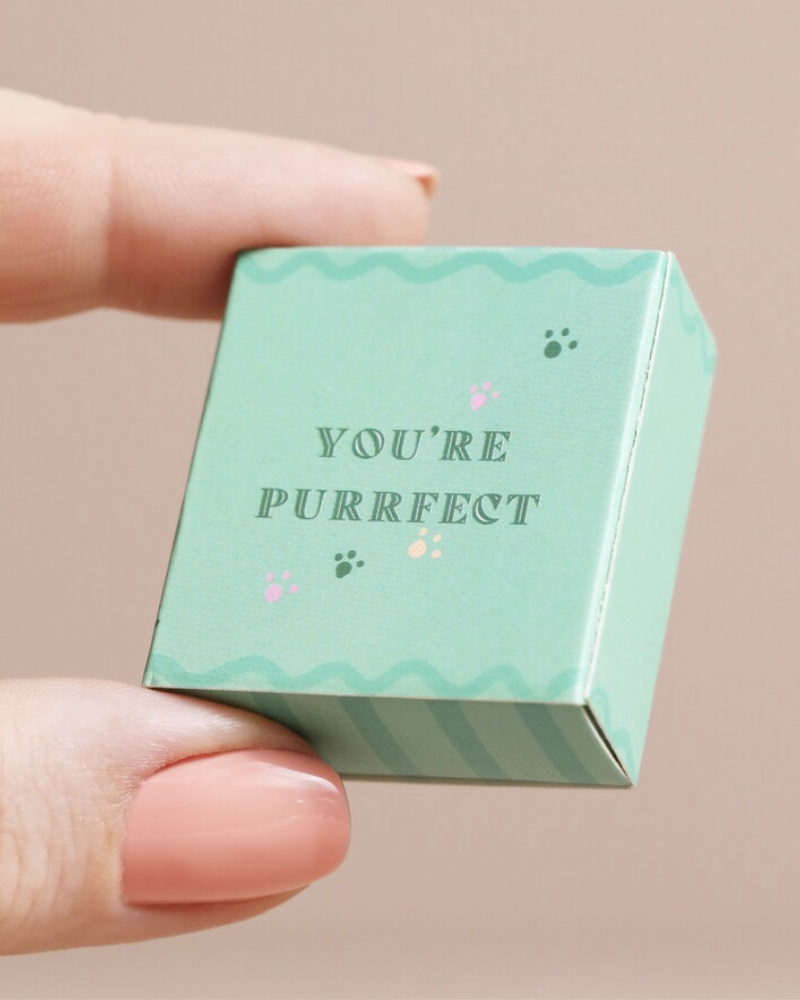 Calling all cat lovers! A sweet charm gift boxed with the message "You're Purrfect".