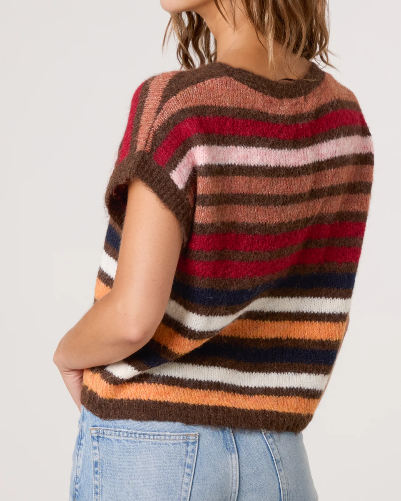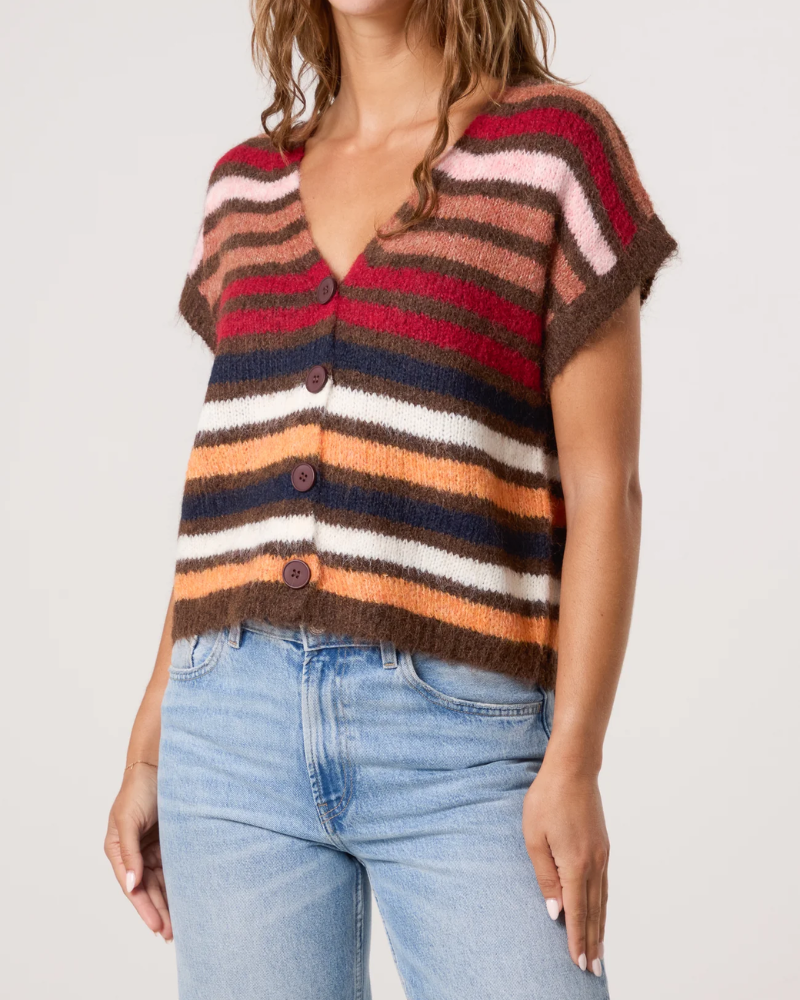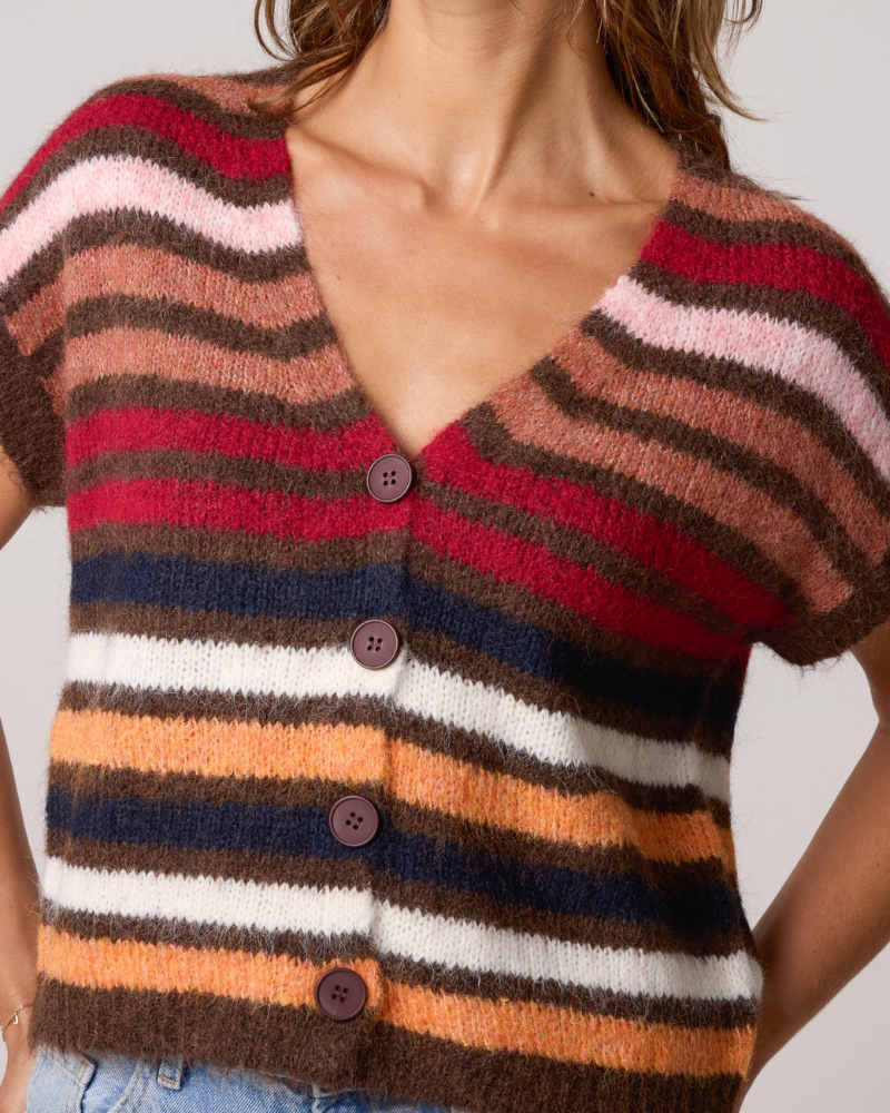 Add a playful retro touch to your autumn wardrobe with this Striped Colourful Knit Vest Cardigan. Featuring cap sleeves and warm autumnal shades, its vibrant stripes bring fun and flair to layering. Perfect for crisp days, this cozy knit combines comfort and style in a charming, season-ready design.