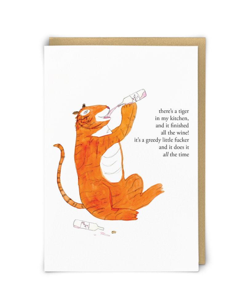 "There's a tiger in my kitchen and it finished all the wine! It's a greedy little fucker and it does it all the time."