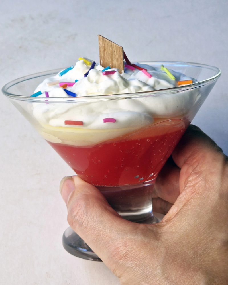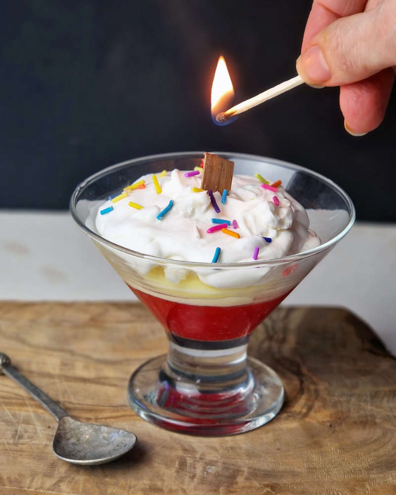 This dessert trifle candle with layers of jelly, custard, cream and sprinkles in a cute glass transports you back to childhood. The three layers of wax are hand poured into one of our gorgeous glasses to create an artistic candle. The base is a red coloured jelly wax which is covered in yellow custard topped off with the fluffy white wax at the top simulating the whipped cream. It has colourful sprinkles to add that party air. This is the perfect way to enjoy a proper pudding but without the calories! It makes a perfect gift for anyone with a sweet tooth.