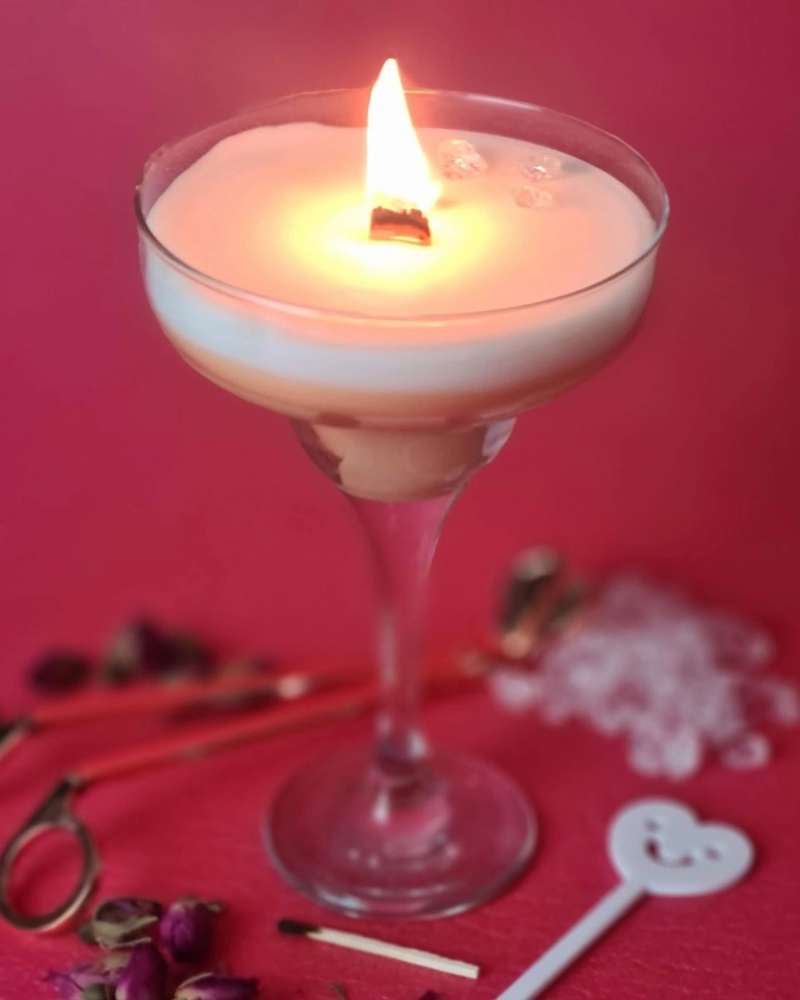 A gorgeous hand poured soy candle in a beautiful cocktail glass made to resemble a Pornstar Martini, complete with glass "ice". The candle is scented with rose and damson. The soy wax is hand poured into one of our gorgeous margarita cocktail glasses to create an artistic candle in the image of an Pornstar martini cocktail.