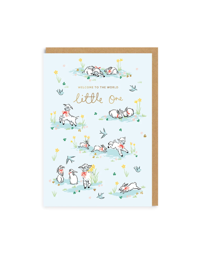 Welcome the little one to the world with our adorable greeting card featuring lovable lambs and bunnies. A perfect way to celebrate the arrival of a new baby.